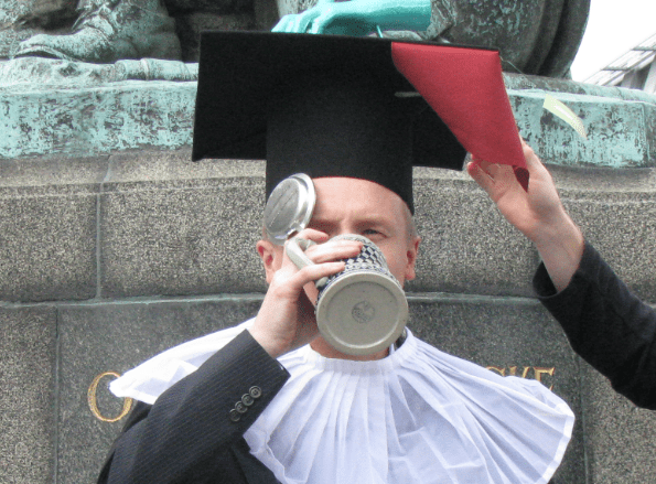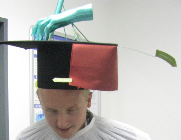 wearing a hat representing the knowledge of the candidate (physically and literally),