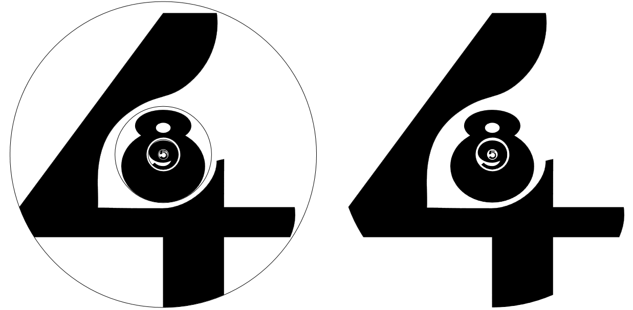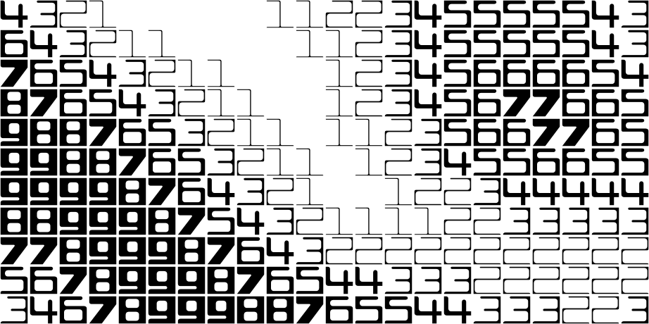 With the examples above you can only represent numbers from 0 (blank fatfont) to 9. To be able to represent numbers with a higher definition, FatFonts are designed so that they can be nested. By putting a digit that is ten times smaller than the original digit inside, we can then represent two-digit values. You can do the same inside this second digit; the only limits are the resolution of your media and the visual acuity of people.