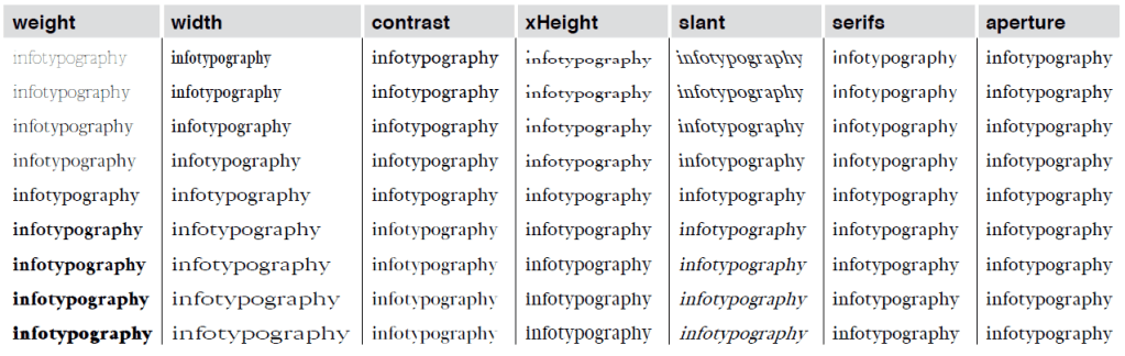 We looked at a set of seven common typographic parameters: weight, slant, x-height, width, contrast, serifs and aperture (this last one with combined with junction).
