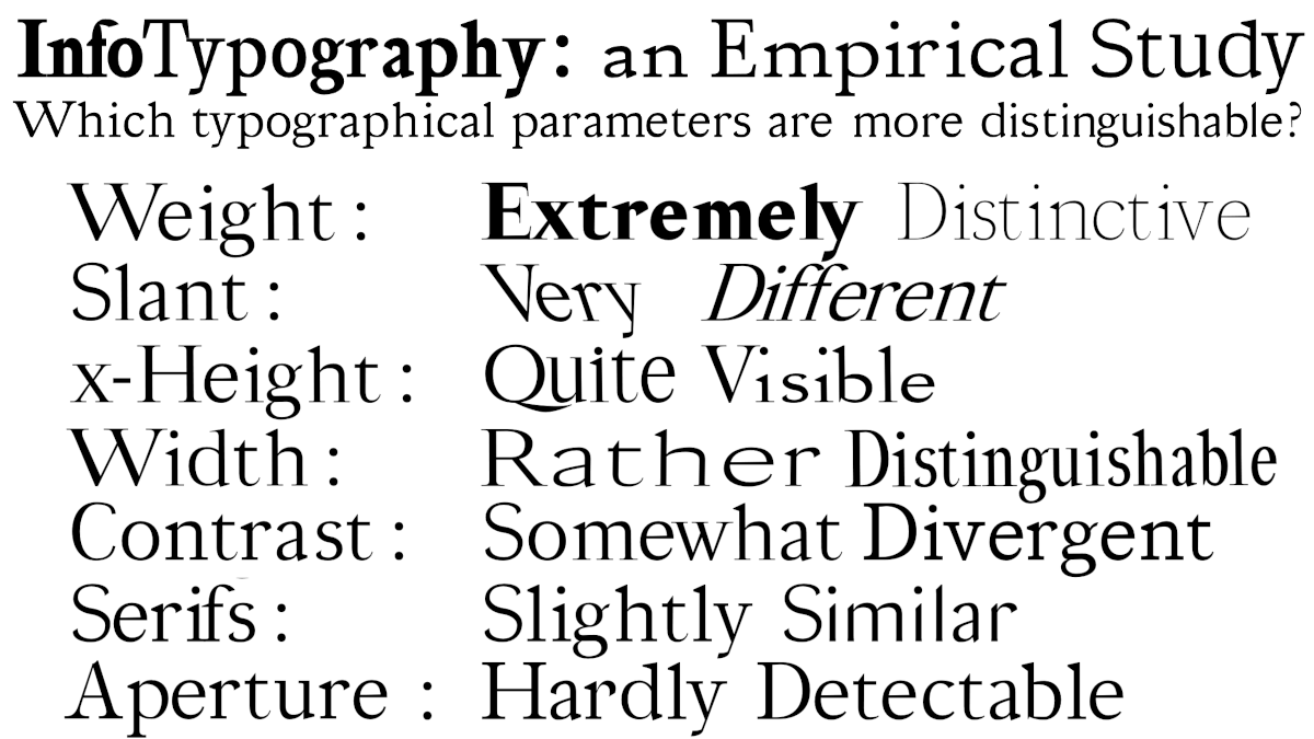- We studied weight, slant, x-height, width, contrast, serifs and aperture and found them distinguishable by humans roughly in that order (weight and slant are most distinguishable).
