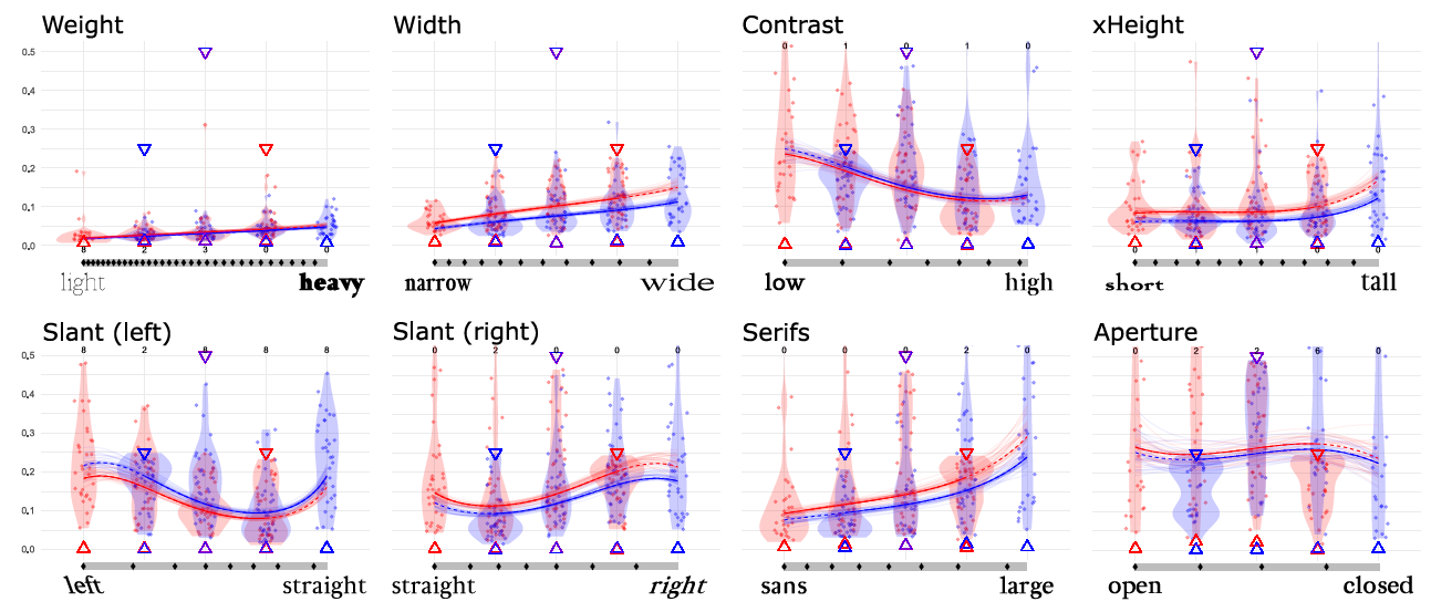 We found that different parameters have different curves. For example, the relationships between the width of a font (in ems) and how people see it, is not linear: the thicker the font, the larger the difference in thickness between fonts has to be to be perceived. For some parameters this is not surprising, since it more or less follows Fechner-Weber’s law. However, for some other parameters there are quite surprising shapes.
