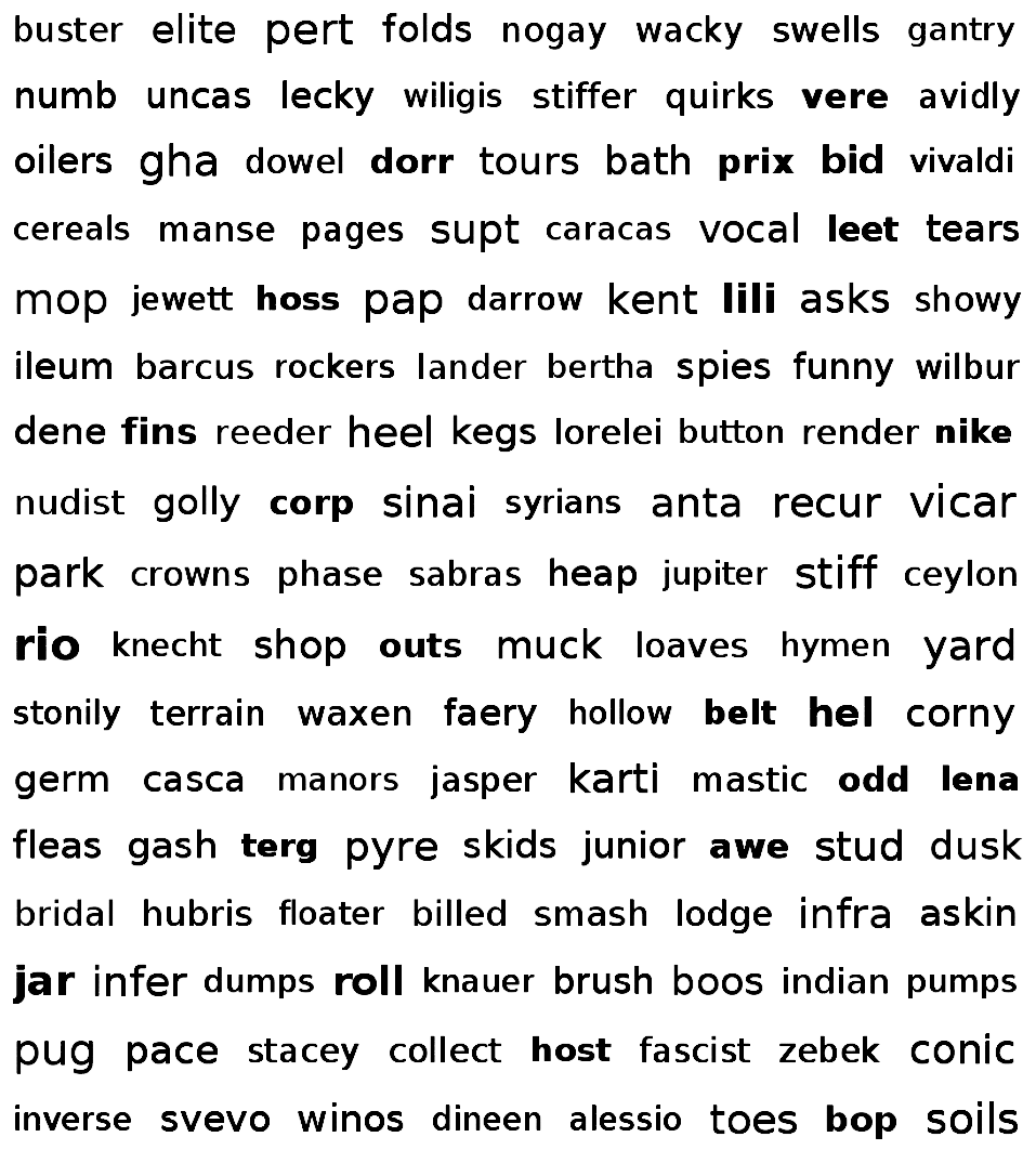 A more modern example of InfoTypography are tag clouds (or word clouds); most use size, but some use other parameters, such as the one below: