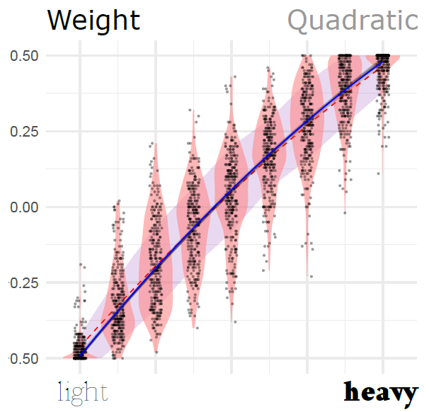 Below is the curve for the weight parameter. Each dot is an instance where we showed a word with a particular level of the parameter. The horizontal position in the plot is what the actual level of the parameter was (for example, if to the right, very heavy weights), and the vertical position of the dot is where the participant placed it in the scale (that is, how heavy they thought it was). You can see in the figure that the curve gets more horizontal the more you move to the right.
