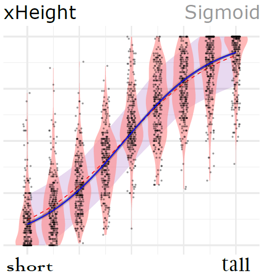 But other curves look very different. For example, x-Height (displayed below), has an S-shape, which means that people can differentiate most when the x-Height is about the middle (or closer to most popular fonts), and less at the extremes.